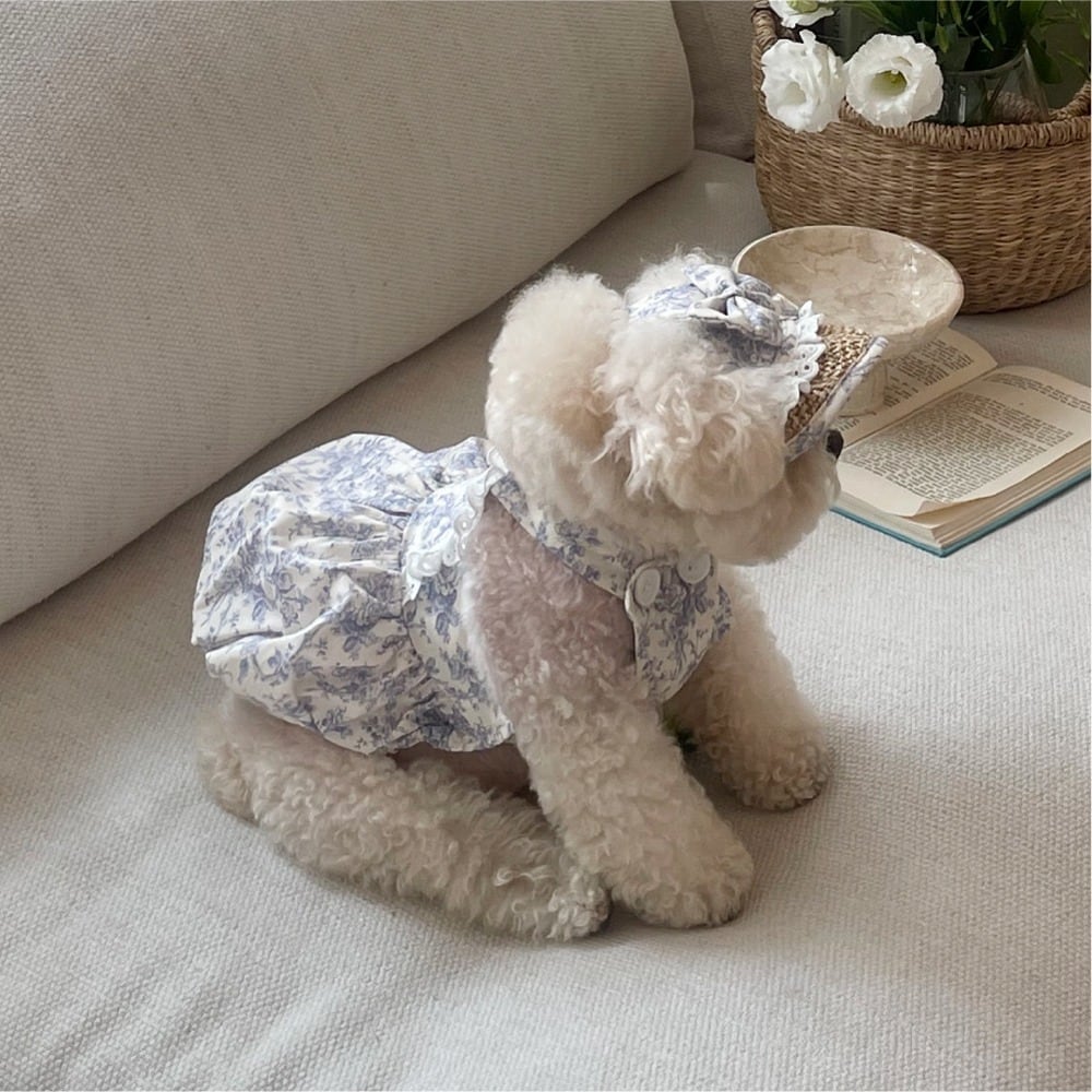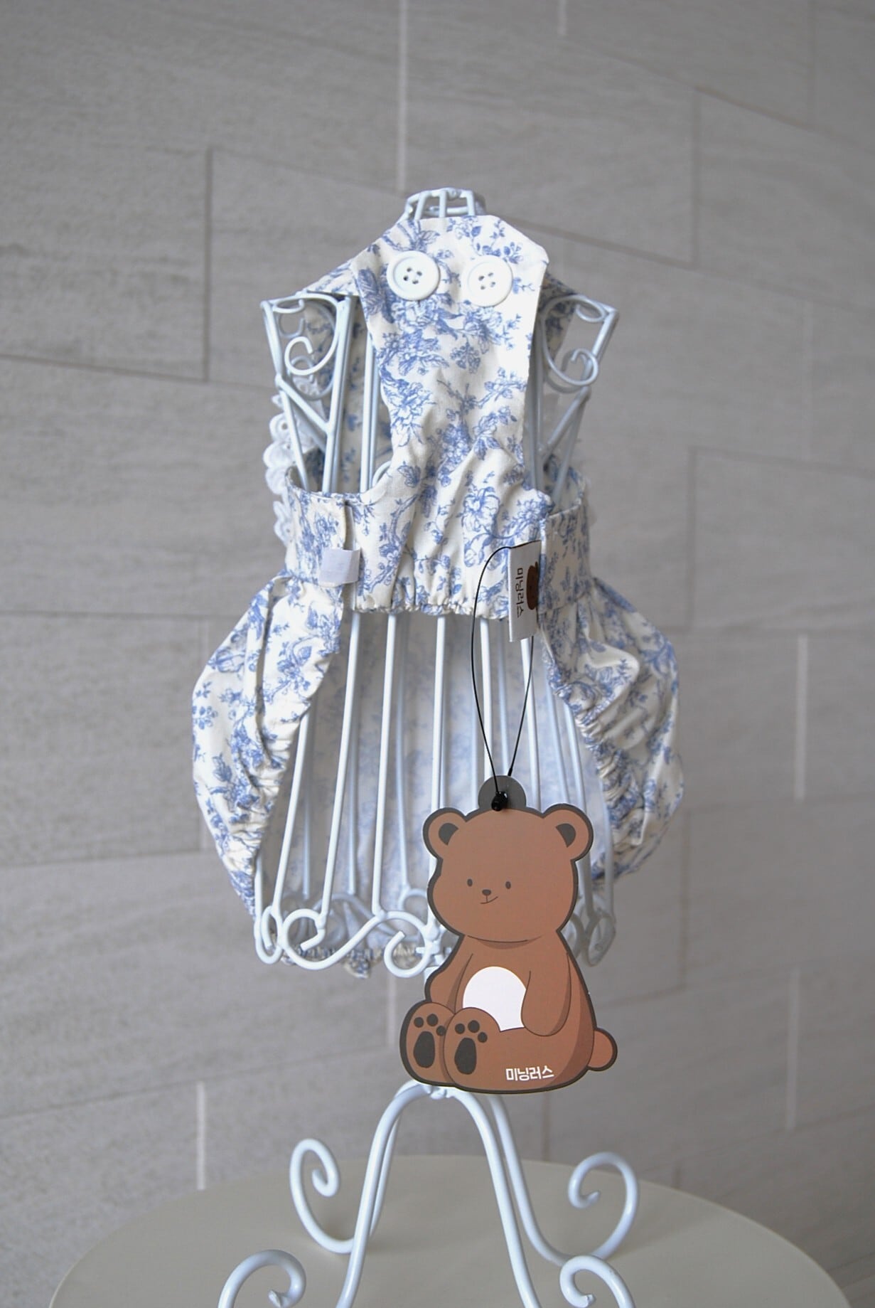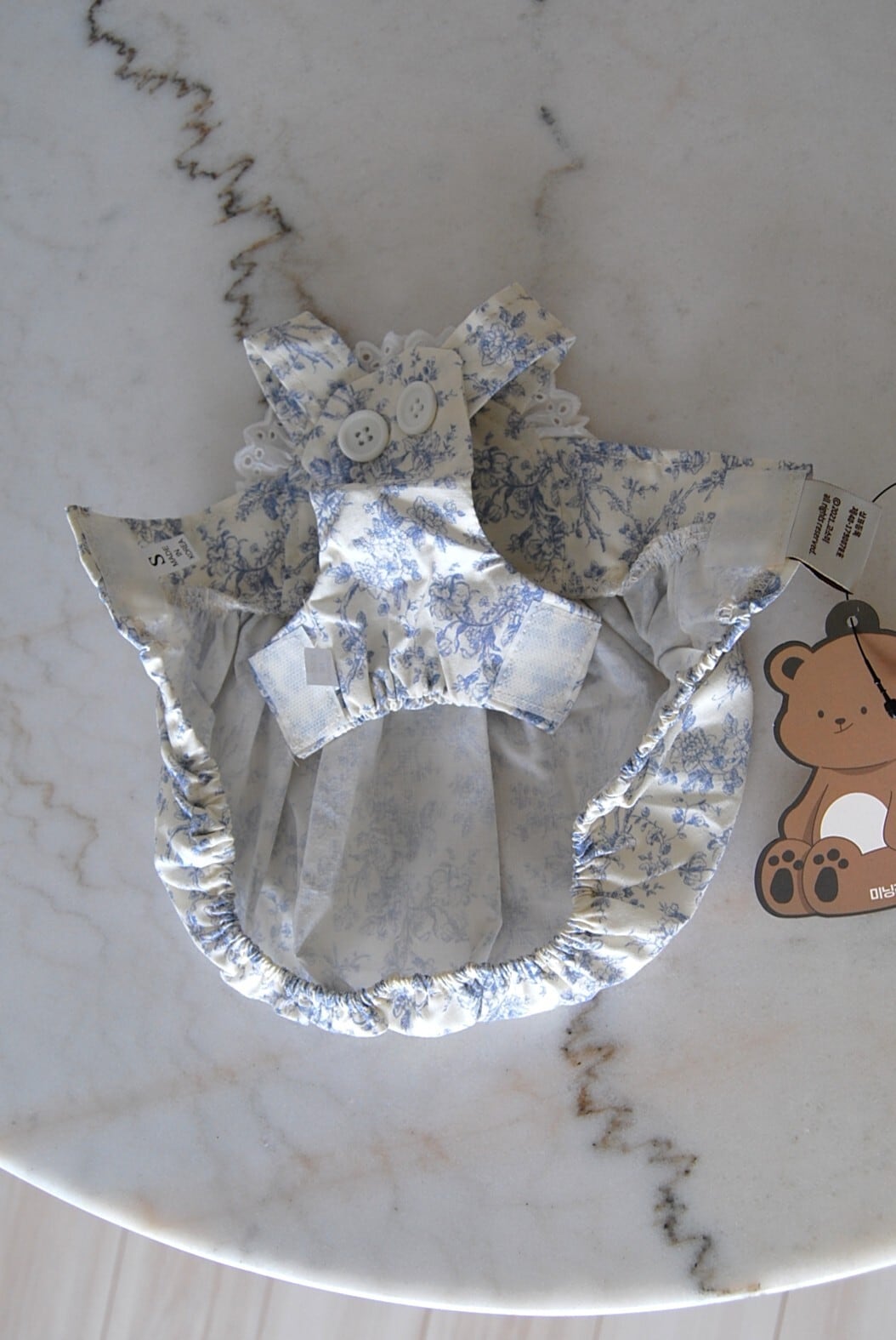 白地にブルーの花柄生地、レースフリルとユニコーンの刺繍があしらわれている