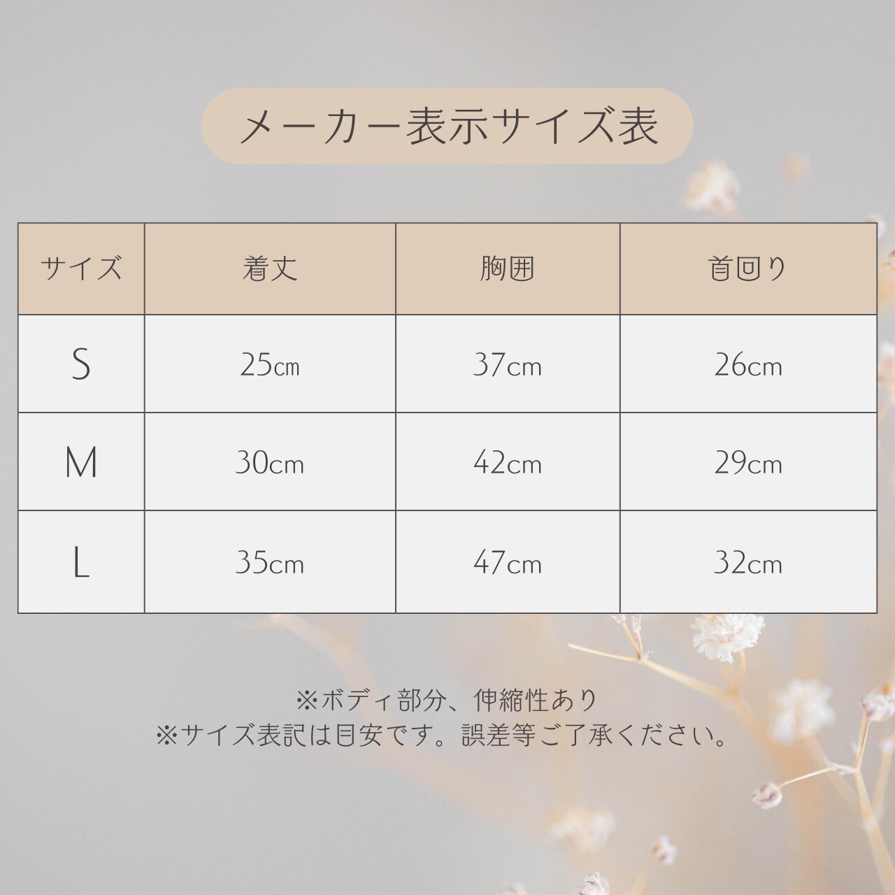 着丈25cm、胸囲35cm、首回り27cm